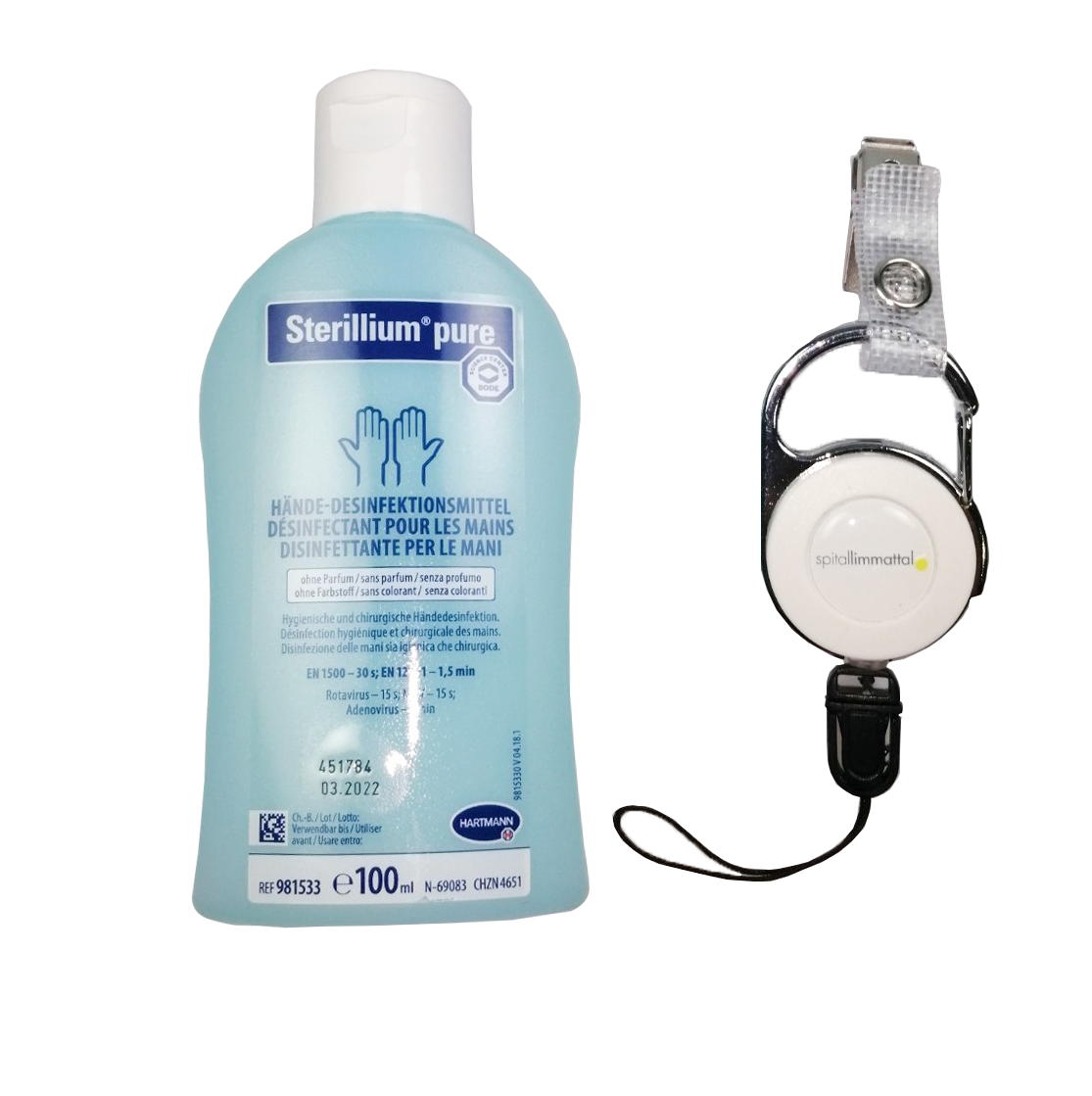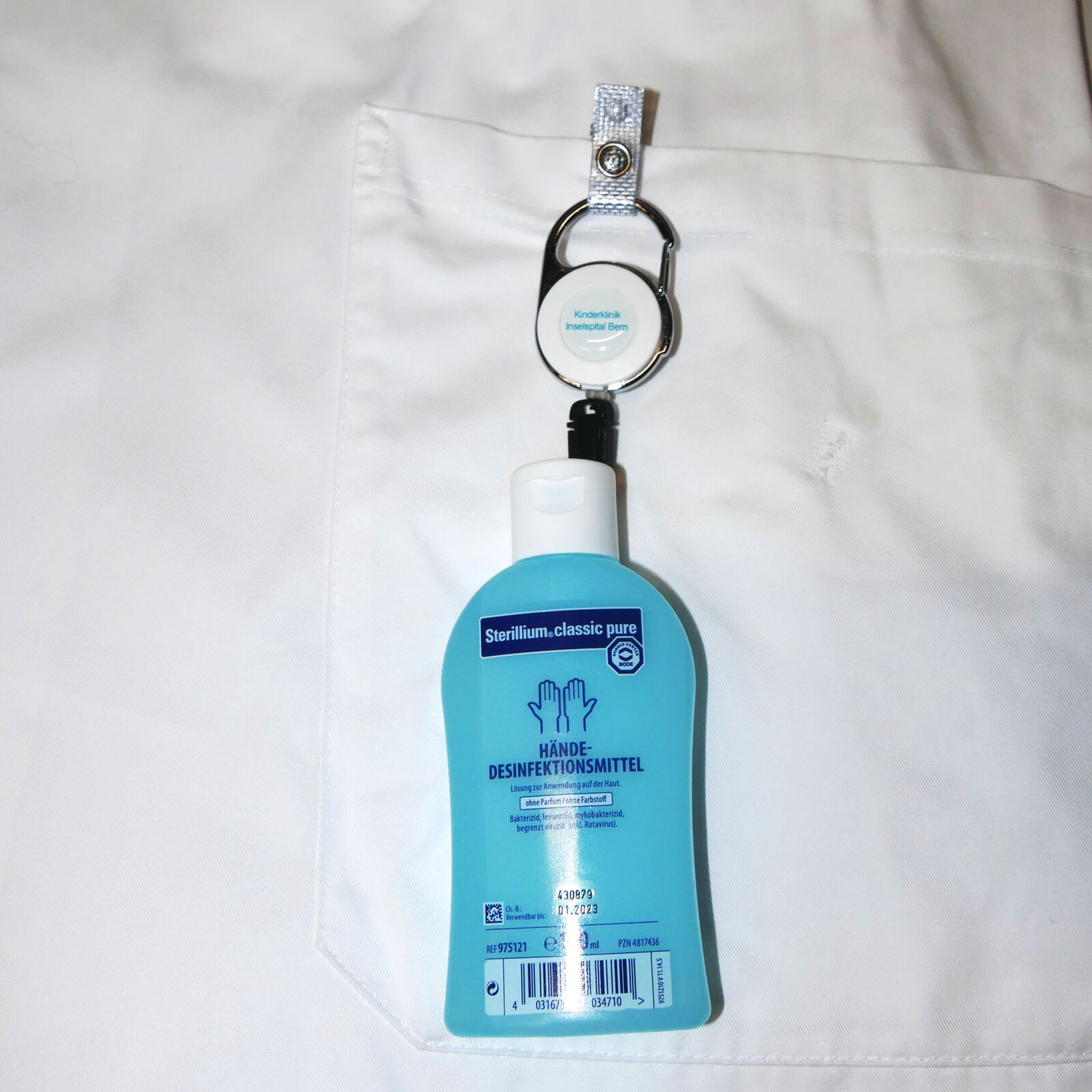 Der JoJo-Auszugsmechanismus mit "LongLifeCord" überzeugt vor allem mit einer längeren Lebensdauer der reissfesten Wachsschnur. Zudem ist der Federzug verstärkt, damit eine Desinfektionsflasche von 50 oder 100 ml einfach angehängt werden kann.
