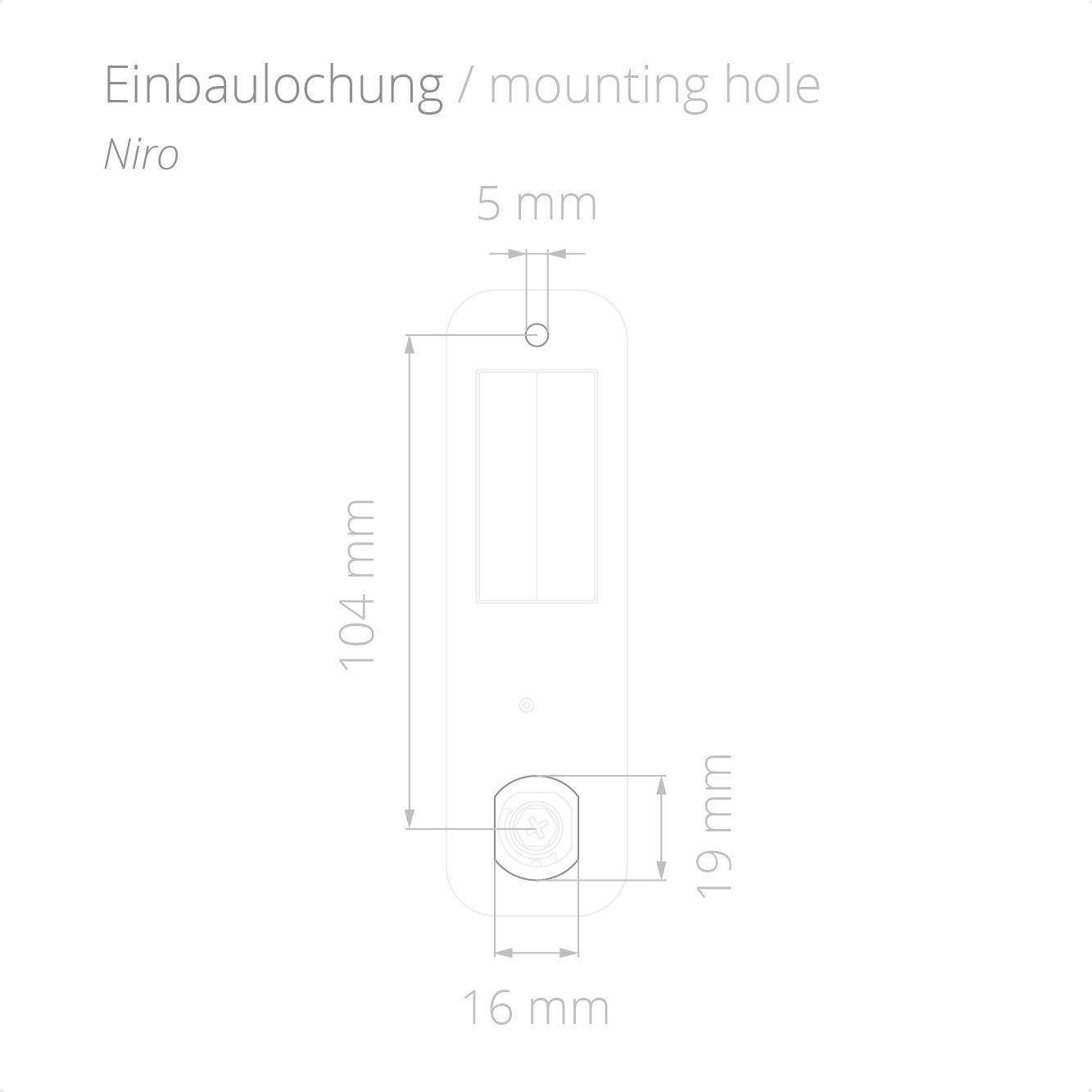 Durch das stabile Zamak-Gehäuse und dem IP65-Schutz (Schutz bei Staub und Strahlwasser) ist es widerstandsfähig und bietet eine lange Lebensdauer. Die schwarze Pulverlackierung, der dezente Aufdruck und das vertikale Design verleihen dem Niro ein zeitloses und schlichtes Aussehen.