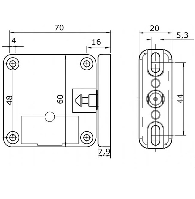 Das Frontal-Schliessteil Latch 75 wird beim furniLOCK (SOLO), furniLOCK-PIN (TEN) hauptsächlich bei Schiebetüren eingesetzt, oder wenn das Schloss am Korpus montiert ist.